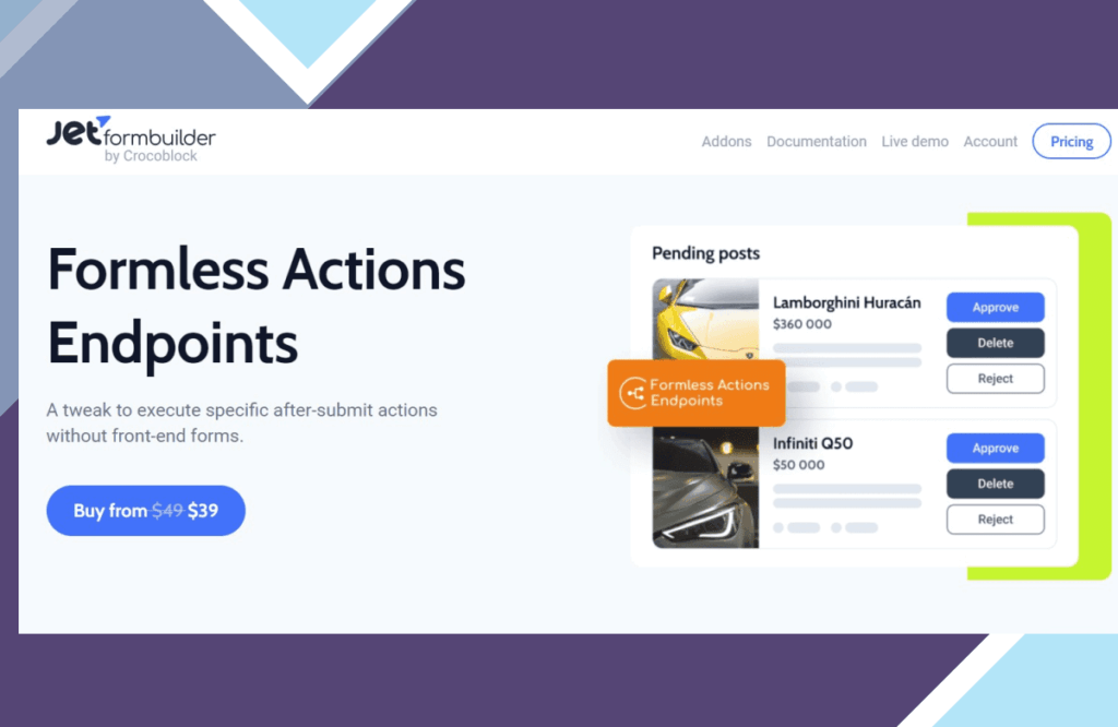 The “Formless Actions Endpoints” addon for JetFormBuilder is a game-changer for WordPress sites, simplifying workflows and increasing website flexibility. This feature allows users to perform actions after form submissions directly from the frontend, ensuring secure data transfers and specific user role execution. Perfect for dynamic web applications and multi-site setups.